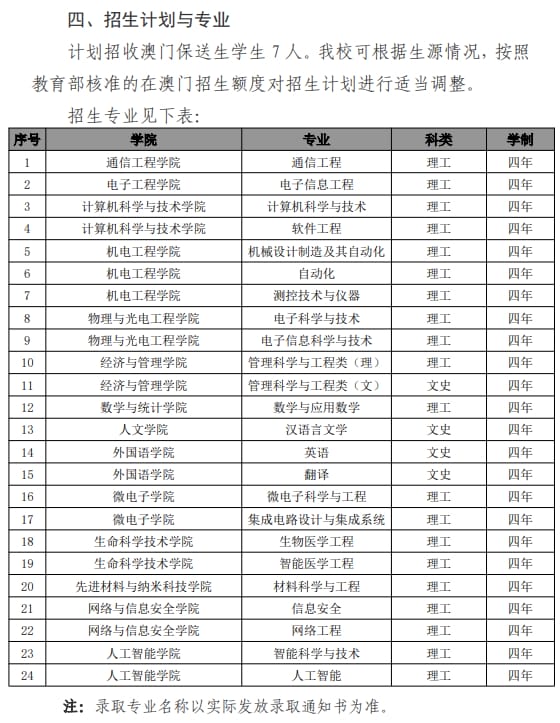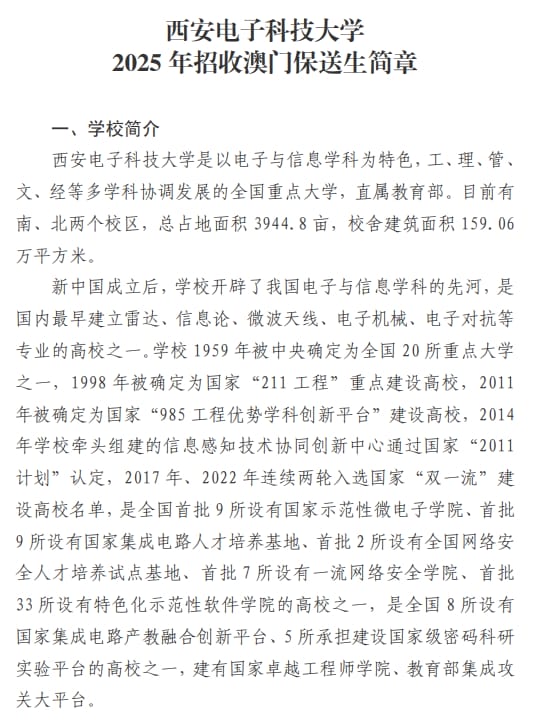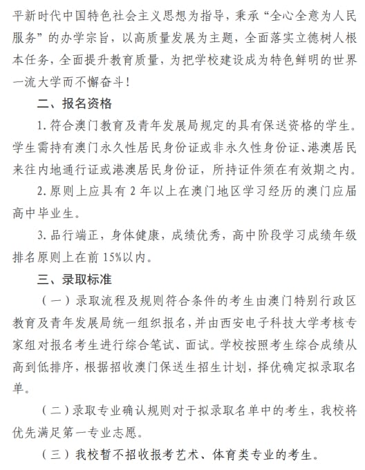 西安电子科技大学2025年招收澳门保送生简章